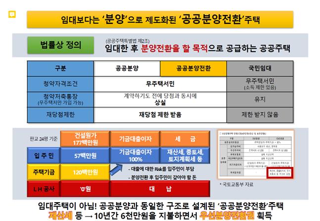 - 입주민들은 분양주택에 해당하는 모든 책임을 10년간 6천만원이란 거주비용으로 감당하며, 오직 우선분양전환권만 쳐다보며 내 집 마련을 꿈꿔왔던 것이다.