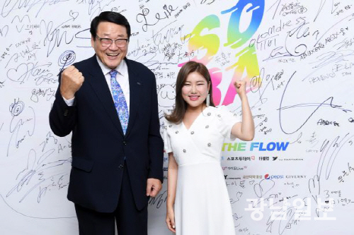 | 소리바다 어워즈 특별상 수상한 트롯가수 송가인양(우), 국민체육진흥공단 조재기 이사장(좌). 2019. 8. 23 <사진=스포츠투데이> |