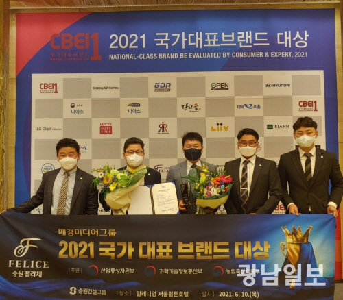 | ‘2021 국가대표 브랜드 대상’을 수상한 승원종합건설 김승구 회장과 직원들이 10일 시상식에서 기념촬영을 하고 있다. |