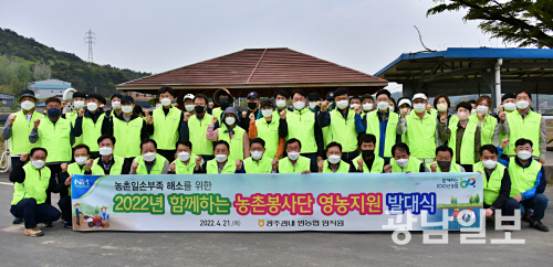 농협 광주지역본부는 21일 본격적인 영농철을 맞아 영농인력 수급난 해소를 위한 범 농협 ‘함께하는 농촌봉사단’ 발대식을 갖고 농촌일손돕기 봉사활동을 실시했다.