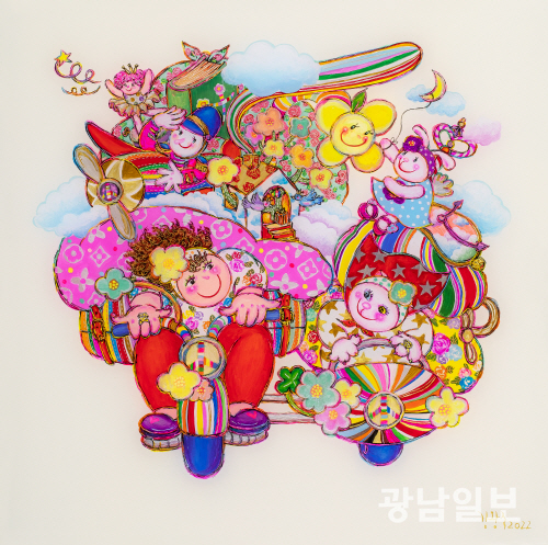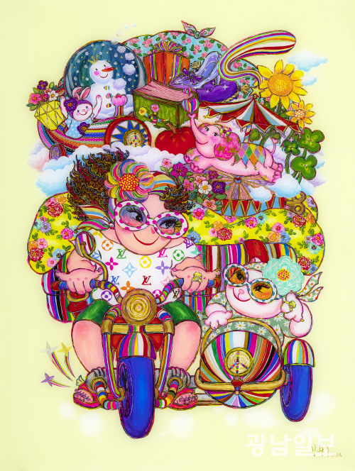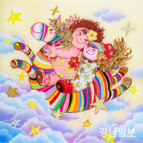 그는 관람객들이 자신을 행복한 사람이라고 봐주면 만족이라고 말한다. 만족이 키워드로 해석된다. 그의 작업 모토가 행복해지는 그림인 이유다. 여기다 그의 화폭에서 자주 보이는 색동의 의미를 묻자 작가는 색감에 바라는 바람이 있었는데 ‘애기들 오래 살으라’고 하는 의미가 투영돼 있다는 것까지 들려줬다. 이 색동의 출발은 유년 시절 자신을 이뻐해줬던 할머니인 듯하다. 늘 할머니는 자신을 위해 기도해줬다는 것이다. ‘할머니가 한복이나 댕기까지 만들어줬을 정도로 자신을 애꼈다’고 귀띔한다. 이때 할머니의 기원을 넣어 작업을 펼치다 보니 색동이 자연스럽게 연결된 것으로 풀이된다.