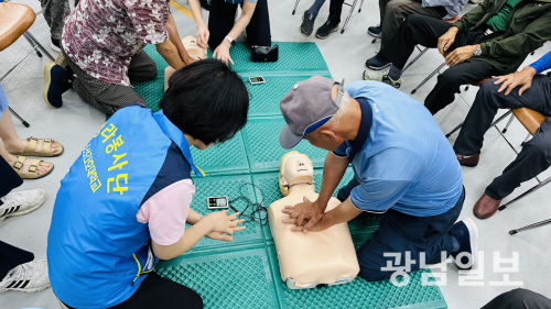 | 봉사단 단원이 어르신에 심폐소생술 방법을 알려주는 모습. |