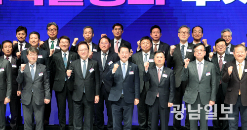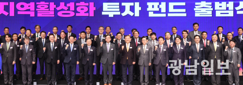 | 김영록 전남도지사가 26일 천안시청 봉서홀에서 열린 ‘지역활성화 투자 펀드 출범식’에서 주요 내빈들과 기념촬영을 하고 있다. 출범식에는 김영록 전라남도지사를 비롯해 최상목 경제부총리, 이상민 행정안전부 장관, 수도권을 제외한 14개 시도 관계자, 산업은행 회장 등 국책기관장, 기업계 및 금융계 대표 등 700 여명이 참석했다. |