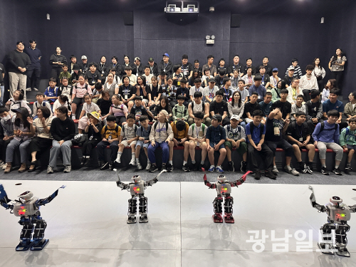 참가자들이 로봇이 춤추는 공연을 관람하고 있다. |