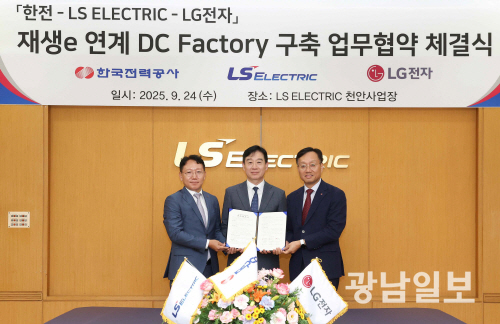 | 한국전력은 최근 LS ELECTRIC 천안사업장에서 LS ELECTRIC, LG전자와 ‘재생에너지 연계 DC Factory 구축’을 위한 업무협약(MOU)을 체결했다. |