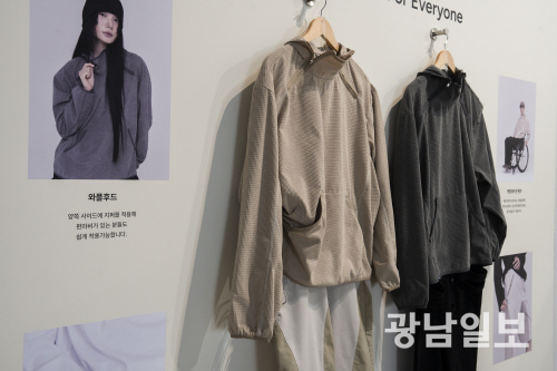 러플(LUPL)의 ‘인클루시브 패션-모두를 위한 옷에 대한 제안’(2025)은 의복을 입는 것조차 어려운 장애인을 위해 시작했다. “옷 입는 게 불편하지만 결국 예쁜 옷을 입고 싶다”는 장애인 인터뷰에 착안해 입기도 편하고, 패션 감각이 있는 옷을 만들었다. 좁은 목선을 넓히는 사이드 지퍼, 물건이 빠지지 않는 깊은 주머니, 와이드 밴딩 등 휠체어나 의족을 사용하는 장애인이 옷을 입을 때 겪는 불편함을 세심하게 개선했다. 아이헤이트먼데이+이노션의 ‘점자 양말’(2021)은 외출 시 양말의 짝과 색상 구별에 어려움을 겪는 시각장애인을 위한 기획이다. 양말 바닥면에 ‘믿음직한 블루’, ‘신비주의 라벤더’ 등 색상 정보와 색상의 감상적인 느낌을 점자로 표기해 시각장애인이 그날의 기분에 맞게 양말을 골라 신을 수 있다.