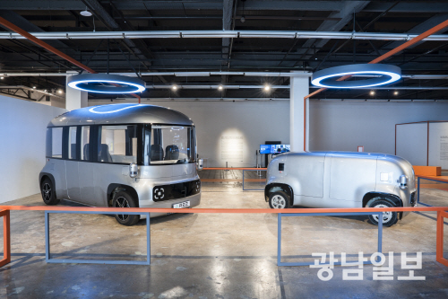 인간의 기본 권리가 된 이동성을 실현하는 무인 셔틀도 있다. 3전시관 입구에 전시된 ㈜오토노머스에이투지(AUTONOMOUS A2Z)의 ‘로이, 코이’(ROii, COii)(2025)는 귀여운 생김새로 관람객들의 눈길을 사로잡는다. 그 중 ‘로이’((ROii)는 다양한 상황을 감지해 사고를 예방하는 안전 시스템이 탑재된 자율 주행 전기버스다. 휠체어 이용자를 포함해 누구나 쉽게 탑승할 수 있는 낮은 바닥 구조로 설계되었으며 실시간 교통 정보와 연동돼 최적의 경로를 운행되기 때문에 노선이나 시간에 얽매이지 않고 유연한 운행이 가능하다. 대중교통이 닿기 어려운 도로 상황이나 지역에 이동의 기회를 제공한다. ‘로이’(COii)는 ‘청계A01’라는 이름으로 지난 23일부터 청계광장에서 광장시장까지 무료 시범 운행 중이며 곧 상용화를 앞두고 있다. ‘코이’(COii)는 물류 인프라가 부족한 지역에 안정적인 배송 서비스를 위해 고안된 물류 디바이스다. 에어리스(Airless) 타이어를 적용해 도로 상황이 좋지 않은 환경에 적합하며, 타이어 정비에 드는 시간 역시 최소화했다.