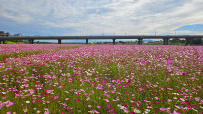 지난 7월 호우 피해를 이겨내고 다시 피어난 코스모스는 가을 하늘과 어우러져 장관을 이루고 있다.
