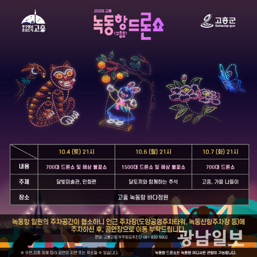 고흥군은 추석을 맞아 10월 4일, 6일, 7일 3일간 녹동항 바다정원 일원에서 ‘드론쇼 및 해상불꽃쇼’ 특별공연을 개최한다.
