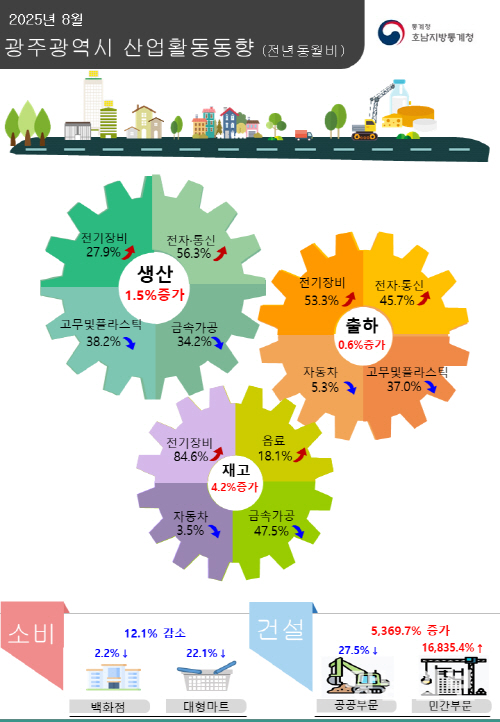 한편, 지난달 광주 광공업 생산은 전기장비(27.9%), 전자·통신(56.3%), 담배(13.5%) 등의 증가에 힘입어 전년 동월 대비 1.5% 올랐다.