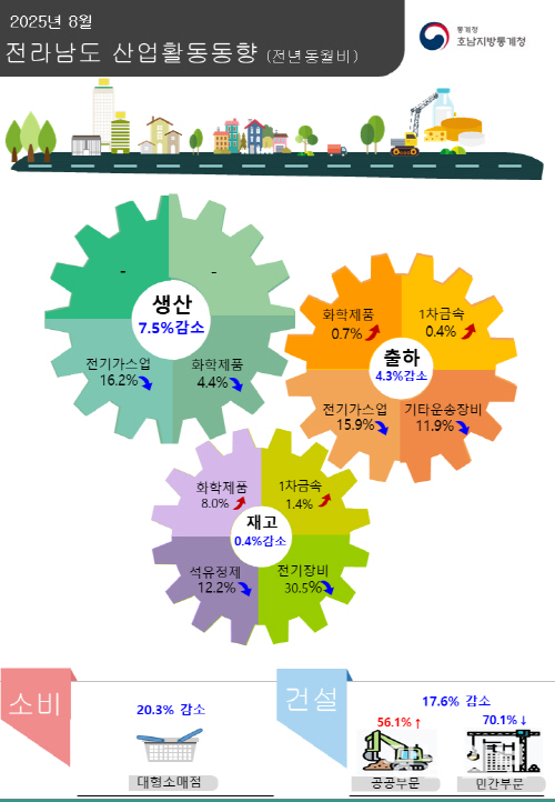전남 광공업 생산은 전기·가스업(16.2%), 화학제품(4.4%), 기타운송장비(12.0%) 등 감소 영향으로 1년 전보다 7.5% 떨어졌다.