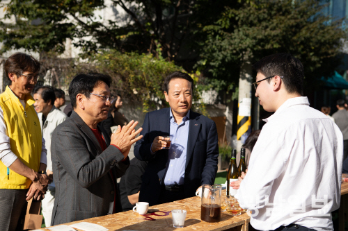 | 지난해 10월26일 광주 동구 동명동 카페거리와 여행자의 ZIP(집) 일원에서 ‘제4회 동명커피산책’이 개최됐다. 사진은 강기정 광주시장(왼쪽 첫 번째), 임택 동구청장(왼쪽 두 번째)이 커피를 시음하는 모습. |