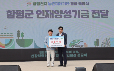 1일 함평군에 따르면 이동우 대표가 최근 함평자동차극장에서 개최된 ‘함평천지 농촌미래기반 통합 출범식’ 행사 중 인재양성기금 1억원을 쾌척했다.