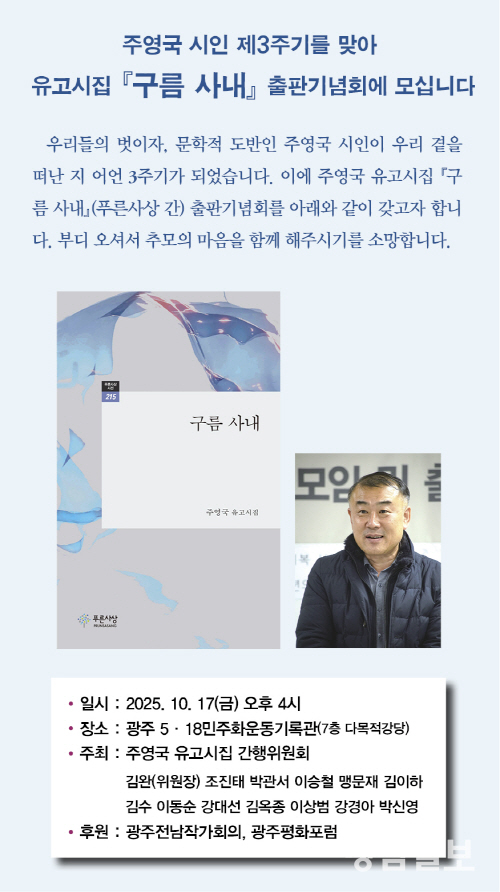 먼저 주영국 시인의 제3주기(10.16)를 맞아 두번째 시집이자 유고시집인 ‘구름 사내’가 푸른사상 시선 215번째 권으로 나왔다. 주 시인은 2019년 1월부터 2020년 12월까지 광주전남작가회의 김완 회장 시절, 사무처장으로 재직하면서 2020년 5.18민주화운동 40주년 기념 ‘오월문학제’ 행사를 비롯, 성공적으로 치러내는 등 조직활동가로서의 역량을 보여준 바 있다. 2019년 10월에 그는 첫 시집 ‘새점을 치는 저녁’(푸른사상사 刊)을 출간해 문단 안팎의 주목을 받았다. 그는 안타깝게도 한창 창작을 할 나이인 2022년 향년 61세의 나이로 타계해 많은 문인들의 안타까움을 자아낸 바 있다.