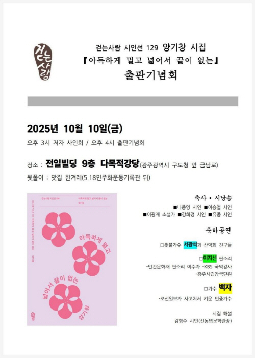 출판기념회는 10일 오후 4시 전일빌딩245 9층 다목적강당에서 열린다. 축사와 시낭송에는 나종영 이승철 시인, 이광재 소설가, 유종 시인, 강희정 시인 등이, 축하공연에는 촛불가수인 서광석과 산악회 친구들, 인간문화재 판소리 이수자인 이지선(광주시립창극단원), 가수 백자가 각각 함께 한다. 시집 해설을 쓴 김형수 관장(신동엽문학관)도 연단에 올라 양기창 시인의 시세계를 들려줄 예정이다.