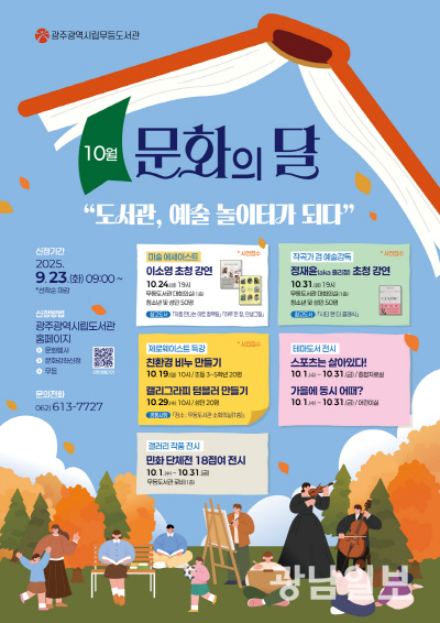 송경희 시립도서관장은 “10월은 나들이하기 좋은 계절이다. 시립도서관에서 준비한 다양한 문화예술 체험이 특별한 경험이 될 것이다”며 “시민들에게 배움과 문화가 어우러지는 풍성한 10월이 됐으면 한다”고 말했다.