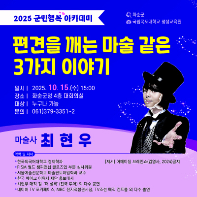 군민행복 아카데미는 군민에게 평생학습의 기회를 제공하기 위해 다양한 분야의 명사를 초청해 진행하는 강연 프로그램으로, 별도의 신청 없이 누구나 자유롭게 참여할 수 있다. 자세한 사항은 화순군 인구청년정책과 평생교육팀(061-379-3351)으로 문의하면 된다.