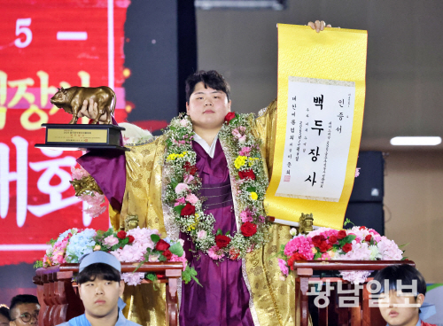 김민재는 지난 8일 울산광역시 울주군 울주종합체육센터에서 열린 대회 백두장사 결정전(5판 3선승제)에서 같은 팀 동료인 백원종(영암군민속씨름단)을 3-0으로 누르고 꽃가마를 탔다.