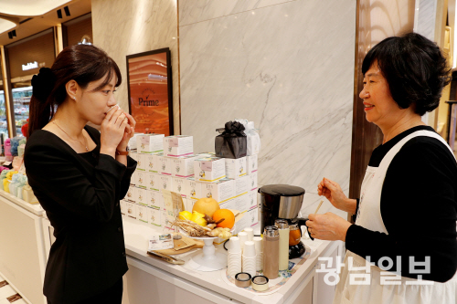 광주신세계 본관 지하 1층 혜량 팝업스토어에서 직원이 시음하는 고객에게 꽃뿔차의 효능을 설명하고 있다. |