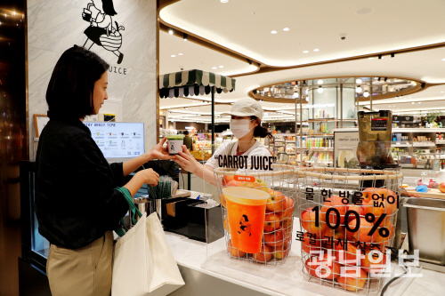광주신세계 본관 지하 1층 오롯이 주스에서 직원이 고객에게 스위트 그린 음료를 전달하고 있다. |