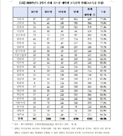 학교별 저소득층 비율은 충북대(9.8%), 서울시립대(8.5%), 경희대(8.0%)가 상대적으로 높았고, 중앙대(3.2%), 고려대(3.3%), 이화여대(3.4%), 연세대(3.5%) 등은 낮았다.