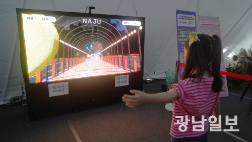 | 나주영산강축제 현장에 설치된 XR인터랙티브 무브먼트 챌린지 체험존에서 어린이가 직접 베타버스 체험을 하고 있다. |