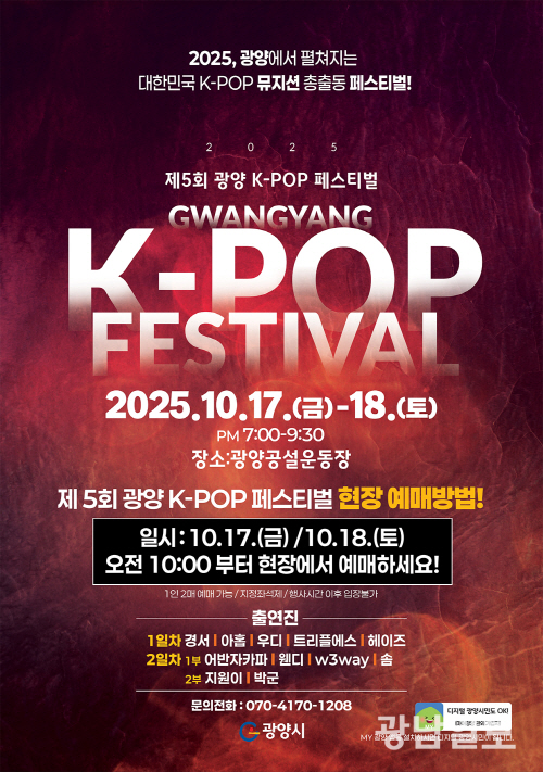 이현주 광양시 관광과장은 “기존의 탄탄한 최정상급 라인업에 신예 아티스트가 합류하면서 라인업이 더욱 풍성해졌다”며 “강렬한 퍼포먼스와 비주얼, 독창적인 음악 스타일로 특별한 감동을 선사할 광양 K-POP페스티벌에 많은 관삼과 성원을 부탁 드린다”고 말했다.