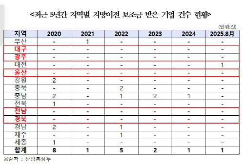 특히 수도권 기업이 지방 이전을 이유로 보조금을 받은 사례는 최근 6년간 단 18건에 불과했다.