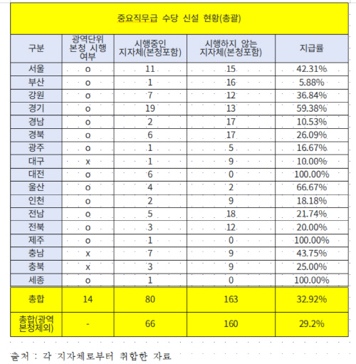 14일 더불어민주당 이상식 의원이 행정안전부 자료를 분석한 결과, 전국 17개 시·도 및 산하 243개 광역·기초 지방자치단체 중 중요직무 수당을 도입한 기관은 80곳(32.9%)으로 집계됐다.
