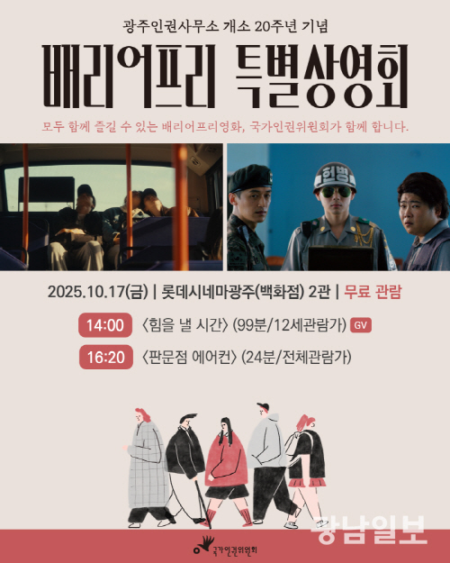 한편, 특별상영회는 광주와 부산에서 진행되며, 네이버폼(https://m.site.naver.com/1QXgu)을 통한 사전 신청 또는 광주인권사무소에 전화 예약을 통해 관람을 신청할 수 있다. 입장료는 무료. 문의 062-710-9722.