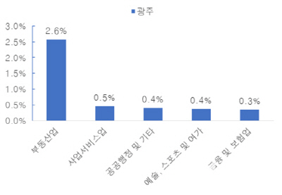 대출 비중이 가장 크게 증가한 산업도 부동산업(6.9%p)인 것으로 나타났다. 광주의 부동산업 대출 비중 증가 폭은 전국(5.4%p)을 상회했다.