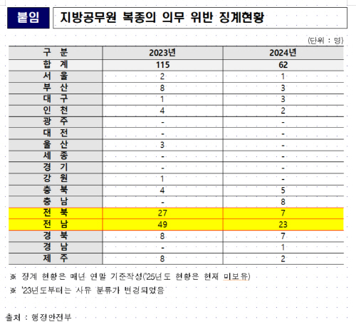 더불어민주당 이상식 의원(국회 행정안전위원회)이 행정안전부로부터 제출받은 ‘2023~2024년 지방공무원 복종의 의무 위반 징계 현황’ 자료를 분석한 결과, 지난해 징계 115건 중 전남이 49건(42.6%), 전북이 27건(23.5%)으로 두 지역이 전체의 66%를 차지한 것으로 집계됐다.