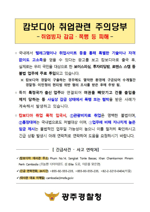 대학수학능력시험(수능) 이후 캄보디아 취업을 빙자한 범죄 피해가 발생하지 않도록 광주교육청과 협조해 학교전담 경찰관이 예방교육을 실시할 계획이다. 실종자 가족이 원하는 경우 심리상담도 지원한다.