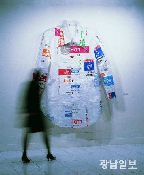 이어 ‘T셔츠’는 광주에서 처음 선보이는 작품으로, 산업용 비닐포대를 바느질하여 만든 거대한 옷이다. 버려진 비닐포대는 옷으로 변모하여 이 시대를 상징적으로 드러내 준다. ‘파편들’ 작품은 전시장을 들어서자 바로 보이는 작품으로 서로 다른 여러 모양의 거울 위에 텍스트가 새겨져 있다. 시대상황, 자연재해, 환경문제, 삶과 죽음, 삶의 단상들을 내포한 텍스트 위로 ‘메타모르포시스’ 작품과 관객의 모습이 중첩돼 작품과 작품이 서로 반영하는 색다른 장면을 볼 수 있다.