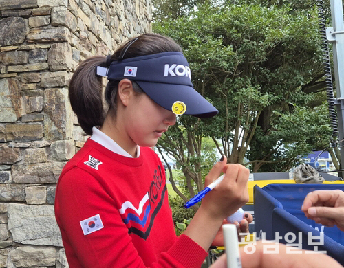 국내 여자 골프 아마추어 최강자인 고교생 오수민이 17일 전남 해남군 파인비치 골프링크스에서 열린 미국여자프로골프(LPGA) 투어 BMW 레이디스 챔피언십 2라운드를 마친 뒤 팬들에게 사인해주고 있다. 연합뉴스 |