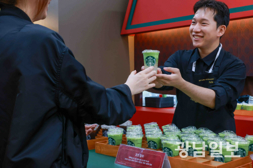 미(美)지엄 행사장 스타벅스 부스에서 스타벅스 파트너가 고객에게 30일 출시 예정인 크리스마스 프로모션 음료 ‘코코 말차’를 제공하는 모습. |