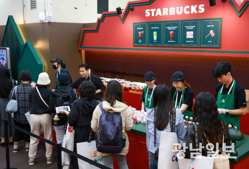 미(美)지엄 행사장에서 미리 만나는 크리스마스를 콘셉트로 부스를 운영 중인 스타벅스가 30일 출시 예정인 크리스마스 프로모션 음료를 고객에게 제공하는 모습. |