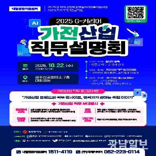 광주경제진흥상생일자리재단은 오는 22일 광주상공회의소 7층 대회의실에서 ‘2025 G-커리어 가전산업 직무설명회’를 개최한다.