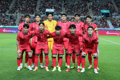 14일 서울 마포구 서울월드컵경기장에서 열린 한국과 파라과이 축구 대표팀의 친선경기. 한국 선수들이 팀포토를 촬영하고 있다. 연합뉴스. |