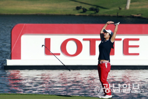 미국여자프로골프(LPGA) 투어 롯데 챔피언십(총상금 180만 달러)에서 우승을 차지한 김세영(22·미래에셋)이 19일(한국시간) 미국 하와이주 호놀룰루 오아후 코올리나 골프클럽(파72·6천383야드)에서 열린 대회 마지막 날 4라운드 18번홀에서 칩인 파에 성공한뒤 기뻐하고 있다. 18번 홀(파4)에서 열린 연장 첫 번째 홀에서 김세영은 약 150야드를 남기고 8번 아이언으로 시도한 두 번째 샷을 그대로 샷 이글로 연결해 짜릿한 우승을 차지했다. 2015.4.19 << LOTTE/박준석 제공 >> 연합뉴스 |
