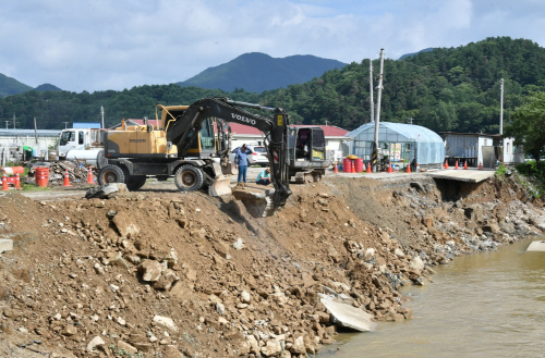 | 집중호우로 인해 제방이 유실된 오례천 |