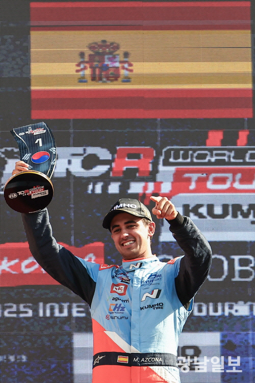 지난 17일부터 19일까지 강원도 인제군 ‘인제 스피디움’에서 열린 ‘2025 TCR 월드투어’ 제6라운드에서 현대자동차 더 뉴 엘란트라 N TCR가 우승을 차지했다. 미켈 아즈코나 선수가 우승을 차지한 후 기뻐하고 있다.