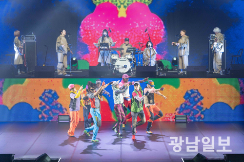 ‘부어내고, 부어내고’로 시작해 ‘가지마오’까지 총 14곡이 연주된 가운데 판소리 ‘흥보가’를 현대적으로 해석한 곡이 울려 퍼지자 거기에 몸을 맡긴 몸짓, 그리고 화려한 영상미와 사이키델릭한 조명까지 소리와 빛, 춤이 한 데 어우러져 새로운 경험을 선사했다. 관객들은 서사를 해체하면서도 전통 판소리 ‘흥보가’의 뼈대를 살리되 현대적으로 해석한 리듬을 통해 자연스럽게 흥얼거렸다. ‘시리렁 시리렁’이나 휘파람 소리 등은 ‘범 내려온다’처럼, 귀에 착 감기면서도 쉽게 따라부를 수 있는 훅이 되기에 충분했다.