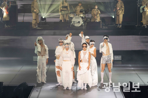 무대 위 의상을 보는 재미도 쏠쏠했다. 세 번에 걸쳐 바뀐 춤꾼들의 의상은 영상미와 어우러져 그 의미를 배가시켰다. 막이 시작되자마자 해외에서 힙하다고 화제가 됐던 동묘 할아버지들의 길거리 패션을 한 댄서들의 완벽한 춤은 질서가 없는 듯 전통 무용의 틀을 깨면서 자연스럽게 무대를 장악했다. 이어진 올 화이트 패션은 니트, 비즈, 깃털 등 소재로 변주를 줘 한층 화려한 분위기를 자아내 음악, 무대 배경과 조화를 이뤘고, 마지막 카모플라주 의상은 ‘듣는 음악’을 넘어 ‘보는 음악’으로 그 자체를 즐기게 했다.