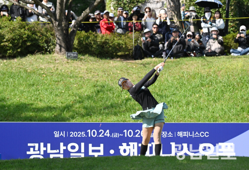26일 나주 해피니스 컨트리클럽에서 열린 한국여자프로골프 (KLPGA) 투어 ‘광남일보·해피니스 오픈’ 2라운드에서 방신실 선수가 드라이버 티샷을 하고 있다.