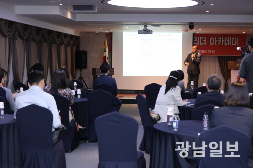 | 지난 23일 광주 동구 호텔아트하임 지하 1층 대회의실에서 열린 제13기 광남일보 글로벌리더 아카데미에 강연자로 나선 서상영 미래에셋증권 WM혁신본부 상무가 ‘레벨업 vs 레벨다운’이란 주제로 강연하고 있다. |