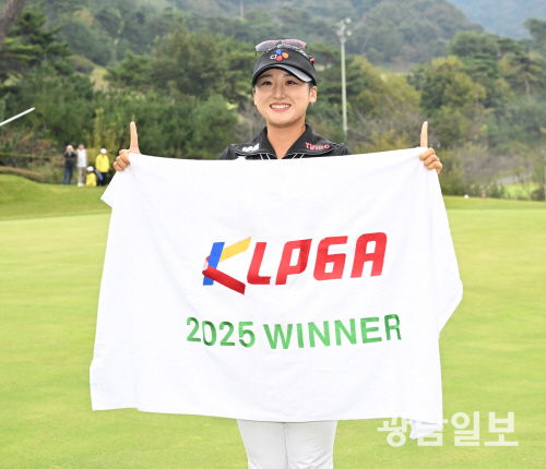 26일 오후 나주 해피니스 컨트리클럽에서 열린 한국여자프로골프투어(KLPGA) 광남일보·해피니스 오픈 최종라운드에서 우승을 확정 짓고 축하 세리머니를 하고 있다.