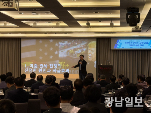 | 광주상공회의소는 28일 라마다플라자 광주호텔에서 ‘트럼프가 흔드는 세계경제, 기업의 생존 전략’을 주제로 KBS 경제부장을 역임한 경제전문가 박종훈 지식경제연구소장을 초청해 제283차 광주경제포럼을 개최했다. |