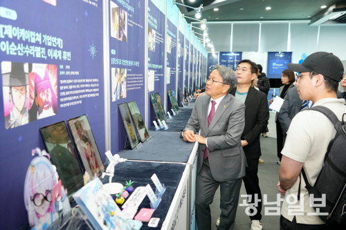 | 강기정 광주시장이 28일 오후 남구 광주실감콘텐츠큐브(GCC)에서 열린 ‘GCC사관학교 제2기 수료식’에 참석해 교육생 성과전시장을 둘러보고 있다. 사진제공=광주시 |