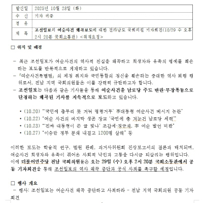 김 의원은 “이러한 보도는 학술적 연구, 법원 판례, 과거사위원회 진상보고서의 결론과 배치되며, 여순사건 희생자와 유족이 겪어온 사회적 낙인과 고통을 다시금 되살리는 행위”라고 비판했다.